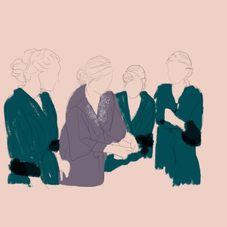 This project is a commission for my sister Olivia, who wanted a digital sketch in the style of my "From Her to Here" piece, celebrating her best friends, and the morning of her wedding when they made up all the bouquets and button-hole pieces for all the bridal party. She loved that moment so much, but the photographer hadn't got a photo of all four of them together - in steps Libby.