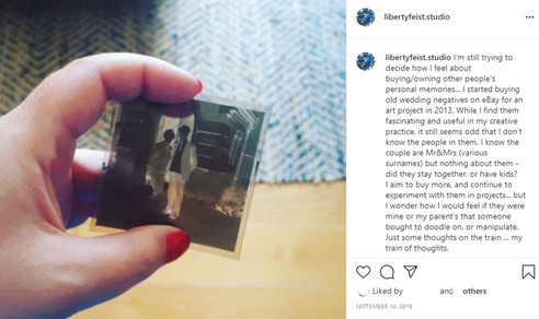 I ended up hating the project (this happened a lot at uni), but there were a few of the experiments made in the process which I still like, and I enjoyed manipulating the negatives on my lightbox to create a manual photoshop session. Anyway, I held on to the negatives, knowing they’d be useful one day but also feeling a need to look after them and feeling some responsibility for their preservation. It wasn’t for a few years that I started to think; these are not my memories. I suddenly felt uncomfortable owning these seemingly meaningless artefacts, posting pictures of them on Instagram… I even had a sort of weird fake wedding album now in my projects archive (part of the ‘Image & Page’ uni project).